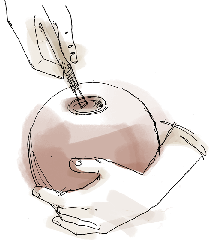 2.L'artisan évide ensuite l'intérieur de la Boule en laisse une ouverture qui permettra d'y insérer les cristaux parfumés.